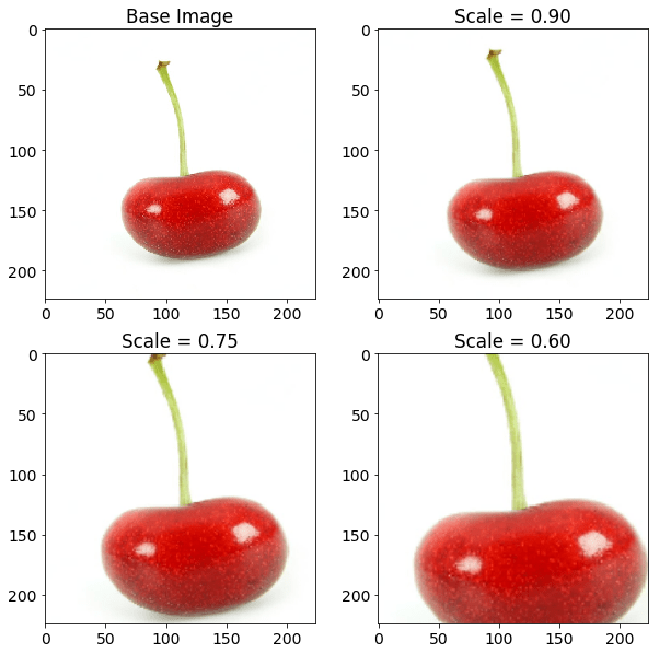 图像被向外和向内缩放。通过缩放,新图像中的一个物体可以比原始图像中的物体更小或更大。