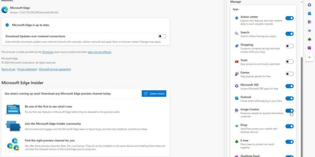 应用最新的更新后,检查Edge的右边侧栏是否有Image Creator的图标。如果你没有看到它,请点击侧边栏底部的+图标。在应用程序列表中寻找Image Creator,并打开其开关,将其添加到右侧的图标中。