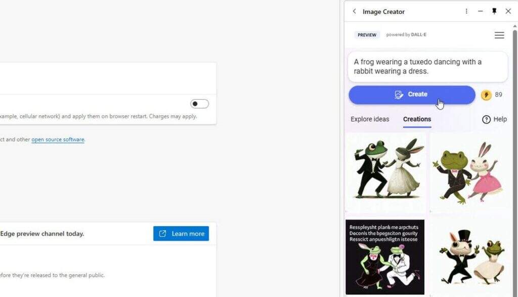 集成的Bing Image Creator工具与独立的专门的Bing Image Creator网站的工作方式类似。输入你想要创建的图像的描述,然后点击创建按钮。默认情况下,会生成四张图片,每张都是一个小缩略图。