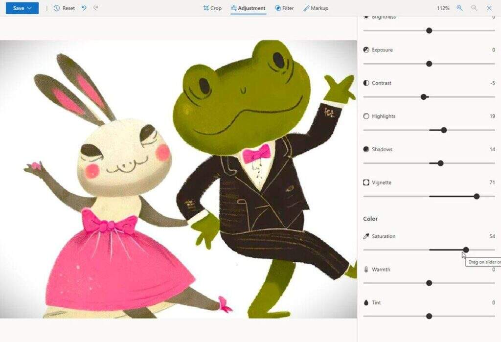 点击调整来修改图像的外观。移动不同条上的滑块来调整亮度、曝光、对比度、高光、阴影、渐晕、饱和度、暖色和色调。
