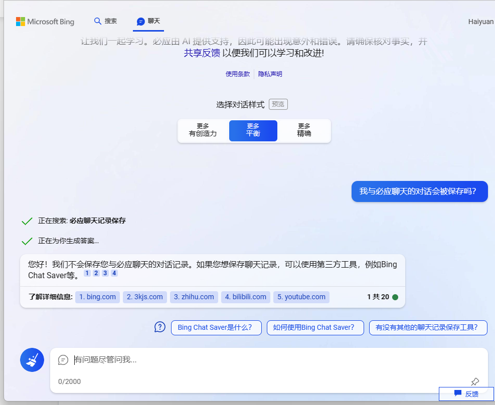 Bing ChatGPT给出的回答中,也明确表示不会保存您与必应聊天的对话记录,如下图所示: