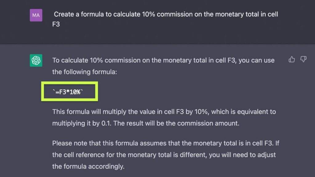 我将完成在电子表格中添加我需要的公式,从佣金计算开始,要求ChatGPT “Create a formula to calculate 10% commission on the monetary total in cell F3(创建一个公式来计算F3单元格中货币总额的10%的佣金)“。