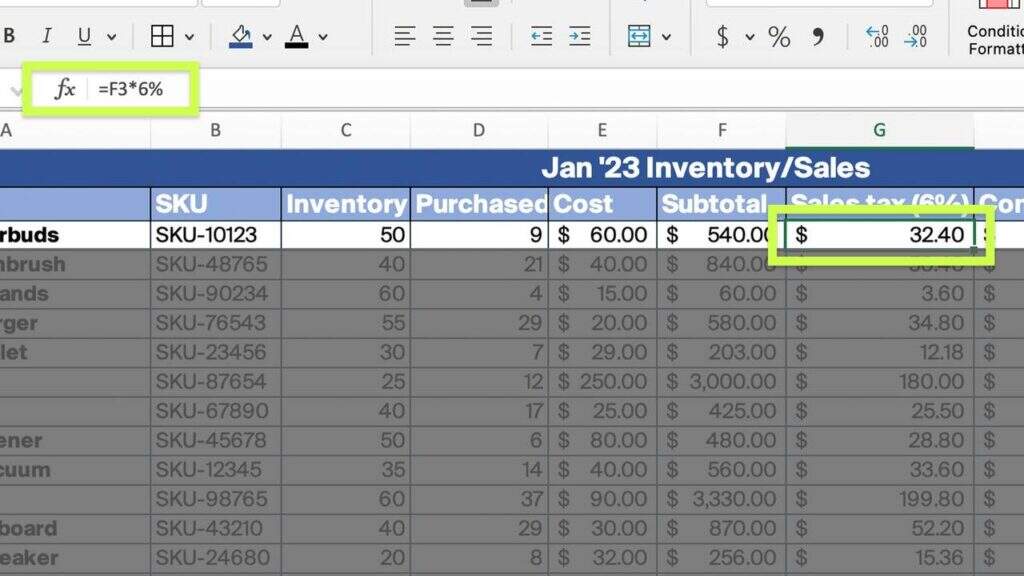 我们要用ChatGPT创建几个简单的公式例子,包括计算销售税(G列)、卖方佣金(H列,未画出)、总额(I列,未画出),以及下个月的库存剩余数量(J列,未画出)。