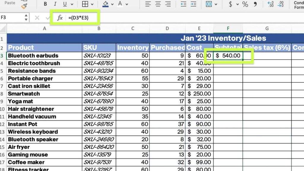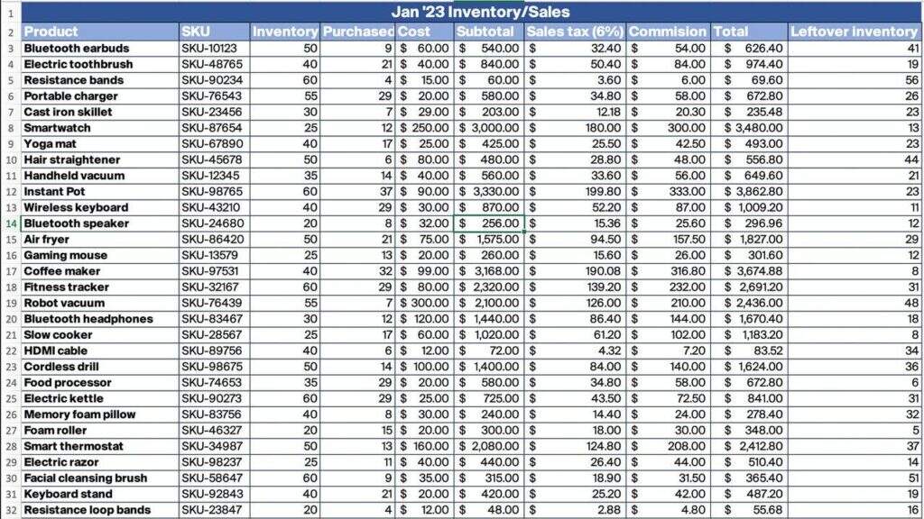 下面的电子表格是我们要使用的例子: 一个捏造的2023年1月的设备清单。它的A列有45种产品,每种产品都有SKU号(B列)、库存量(C列)、1月份购买的数量(D列)、每个单位的价格(E列),以及小计(F列,已经有公式)。