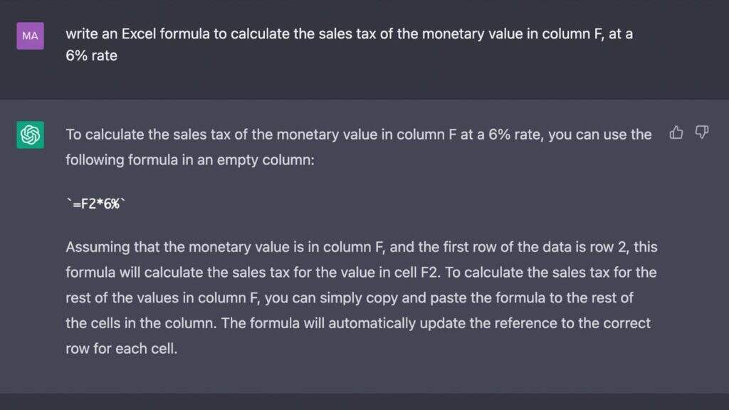 如果我们想让ChatGPT创建其余的公式,我们必须解释得非常清楚和具体,所以我们会要求人工智能聊天机器人 “write an Excel formula to calculate the sales tax of the monetary value in column F, at a 6% rate(写一个Excel公式来计算F列中货币价值的销售税,税率为6%)“。