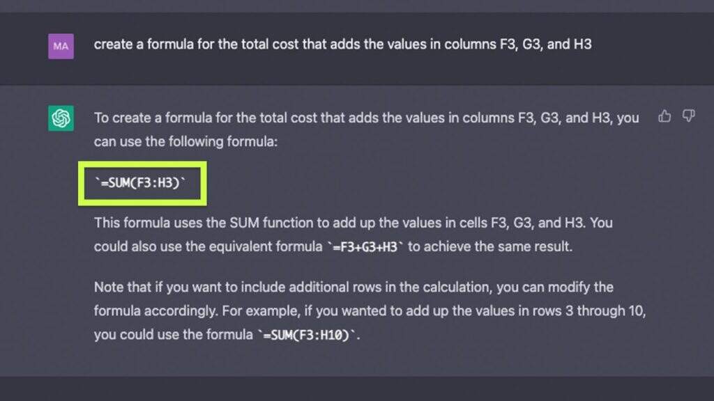 然后我纠正了我的提示,要求ChatGPT “Create a formula for the total cost that adds the values in cells F3, G3, and H3(为总成本创建一个公式,加入F3、G3和H3单元格中的值)“。