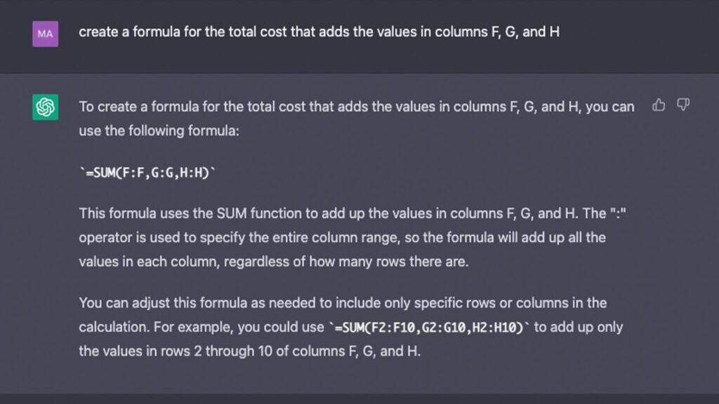 如果ChatGPT给你的公式在Excel或Sheet中不起作用,那么它可能误解了你的提示。仔细研究一下公式,看看ChatGPT的错误在哪里,看看如何重新编写提示语以获得正确答案。在下面的例子中,我的提示是 “Create a formula for the total cost that adds the values in columns F, G, and H(为总成本创建一个公式,将F、G和H列的值相加)“。