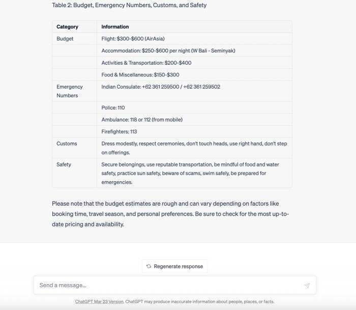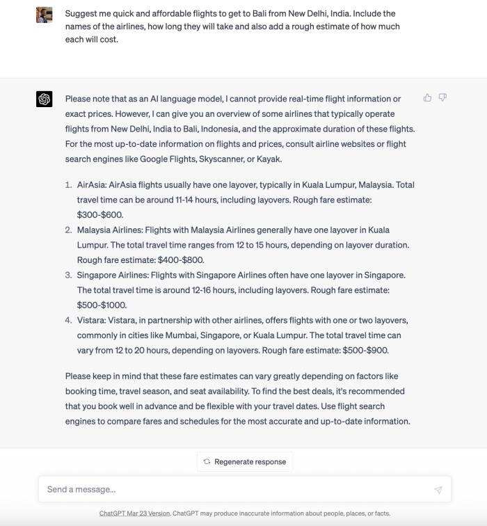 正如我提到的,ChatGPT已经声明它不能提供实时航班信息。但是,它仍然给出了一个价格估计和一些流行的航班选择。我再次检查了从DEL(德里)到DPS(巴厘岛)的建议航空公司的航班价格,同样,它是非常准确的。