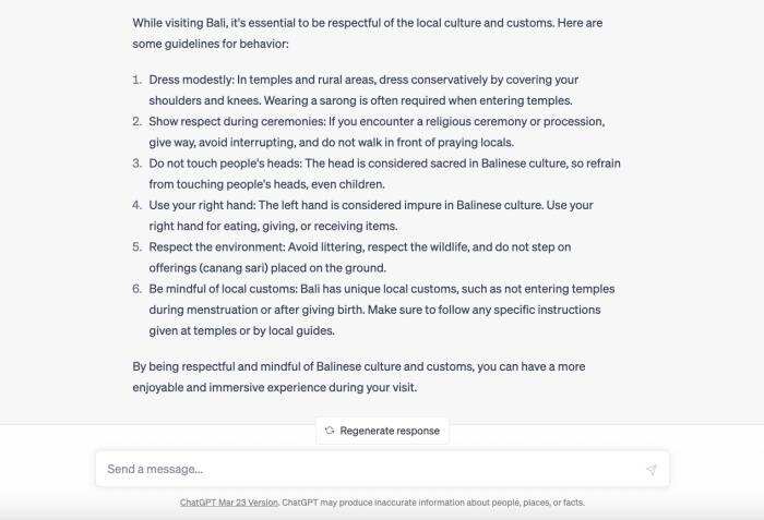 这一步完全是可选的,但我确实想了解更多关于巴厘岛的文化和经验。如果你也想这么做,你也可以在你的ChatGPT中加入这个提示。在聊天中打出以下提示语: