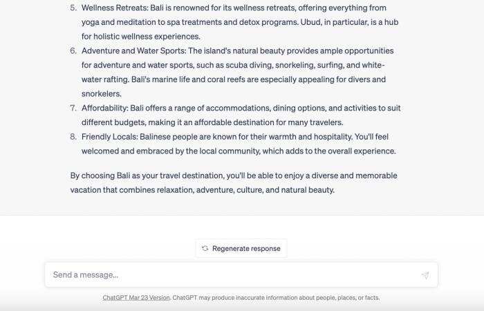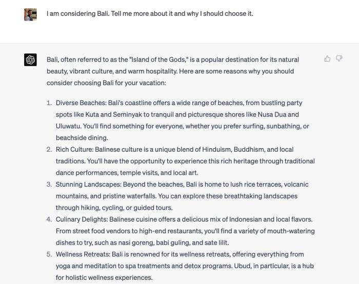 在一分钟内,ChatGPT给了我们五个可以旅行的美丽目的地。然而,在我们最终选择之前,您可以要求ChatGPT告诉您更多的信息。我对访问巴厘岛很感兴趣,所以我将询问一下。在您的聊天中,键入以下提示语 – “I am planning to visit Bali. Tell me more about it and why I should choose it.。