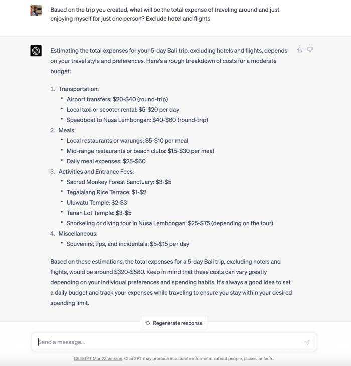 您可能已经为整个旅行制定了预算。然而,如果你是一个对所涉及的费用没有概念的人,那么现在是时候问问ChatGPT,为你的旅行计划做个估计。虽然他们自然不会是100%的最新情况,但他们会给你一个好的起点。我们现在就开始吧。