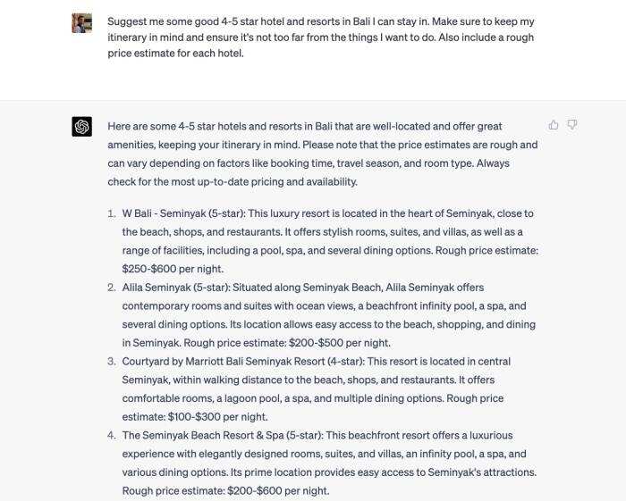 向ChatGPT输入以下提示语:”Suggest me some good 4-5 star hotels and resorts in Bali I can stay in. Make sure to keep my itinerary in mind and ensure it’s not too far from the things I want to do. Also, include a rough price estimate for each hotel.”