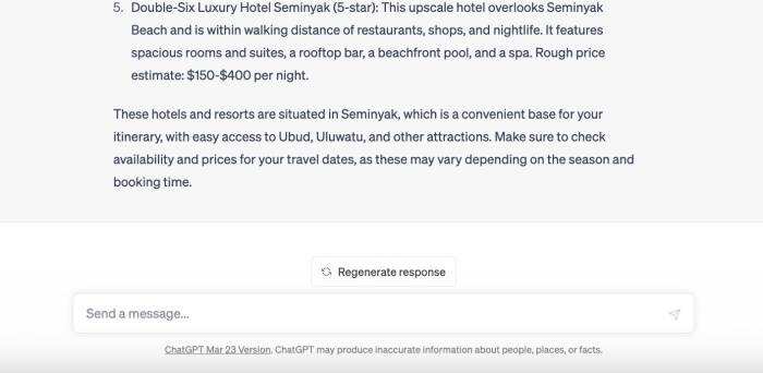 因此,作为我们旅行计划工作的一部分,我们现在有了ChatGPT建议的一份不错的酒店和度假村清单。我将会选择巴厘岛的W酒店,并要求ChatGPT记住它,就像我上面做的那样。
