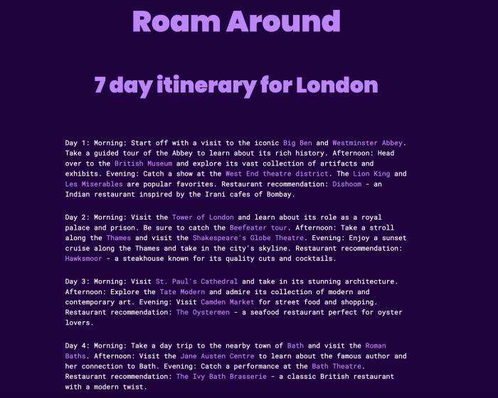 Roam Around是我们遇到的最简单、最即插即用的旅游规划网站之一。该网站使用ChatGPT来快速查询和制定旅行计划。你可以输入任何目的地,Roam Around会立即显示出好的结果。然而,请注意,行程是固定在标准的7天。