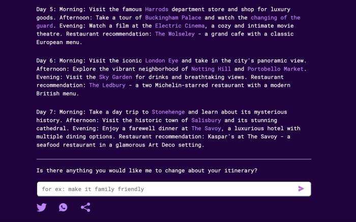 然而,为了解决这个问题,人工智能旅行计划器允许用户改变他们旅行的一些事情,包括为孩子或宠物添加某些点。然后它对旅行计划进行相应的修改。虽然没有ChatGPT的旅行计划那么详细,但Roam Around仍然是有用的。