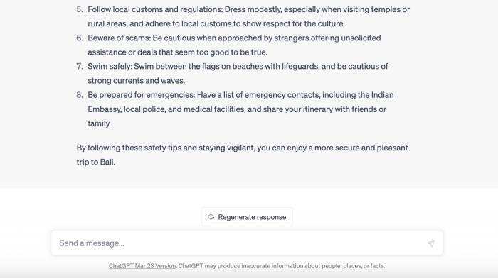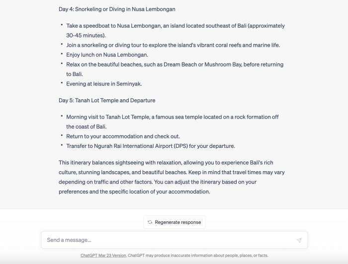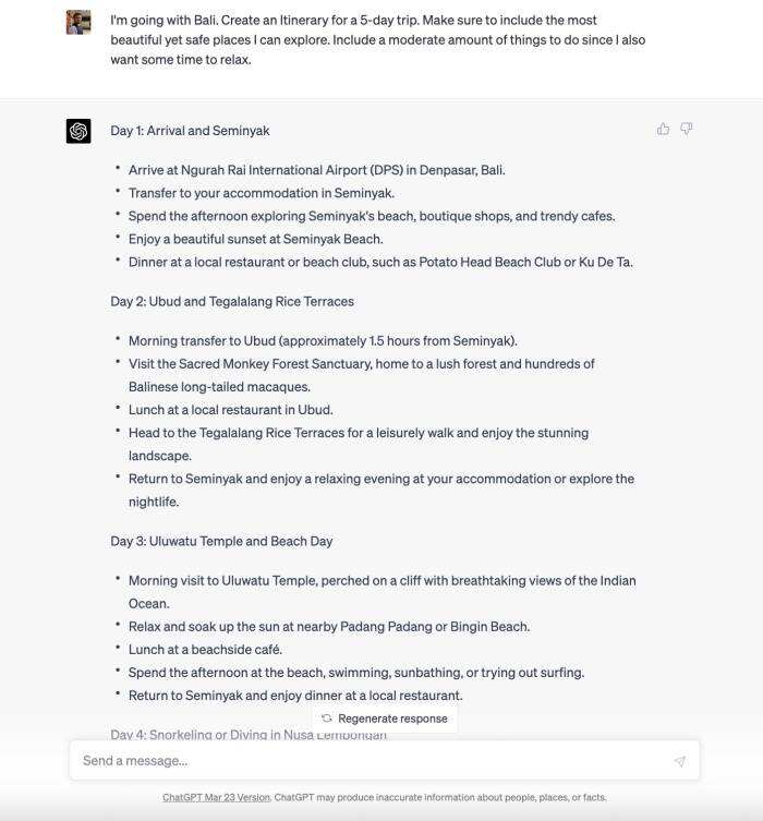 现在是我们实际计划旅行的部分。根据您选择的目的地和生活方式,您选择的天数可能会有所不同。我正在计划一次慷慨的五天旅行,在那里我可以探索巴厘岛。让我们开始询问ChatGPT的旅行计划。