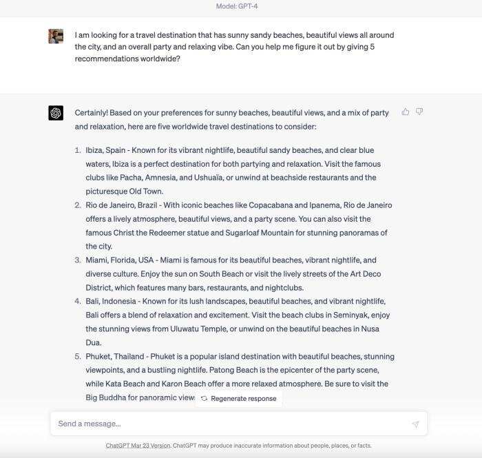 我们首先要弄清楚我们要去的地方。值得庆幸的是,如果您不知道要去哪里旅行,ChatGPT也可以帮助您弄清楚这一部分。但是,请尽量对您的需求有一个大致的概念,包括一般的天气状况和您理想中的地方的氛围等内容。有了这些,我们开始吧。