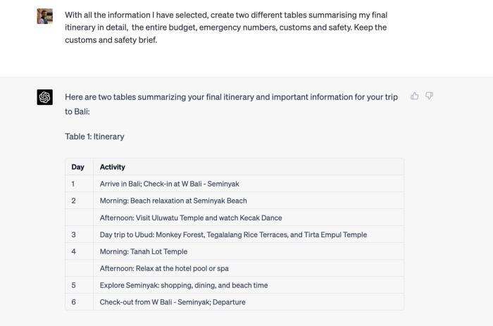 就这样,在ChatGPT的帮助下,我们的整个旅行计划已经准备就绪。现在,虽然ChatGPT本身不能导出你的计划,但它可以创建整洁的表格,你可以截图和存储供你参考。让我们开始这样做吧。