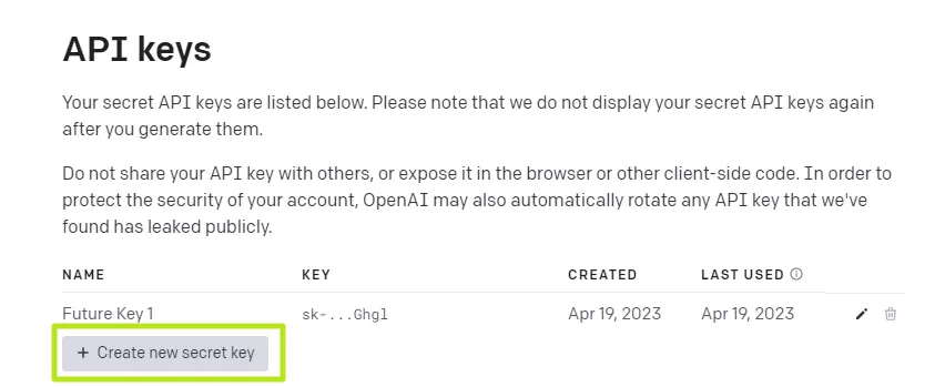 2. 如果你还没有OpenAI的API密钥,请获取一个。你可以通过浏览OpenAI的API密钥页面,登录/创建一个免费账户,并点击创建新的密匙按钮来获得一个。然后你将有机会复制密钥,你再也无法得到它(尽管你可以创建新的密钥)。