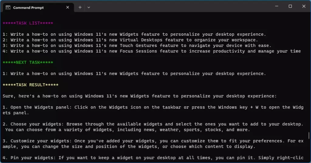 例如,我要求BabyAGI生成一个关于流行的Windows主题的五个教程的列表,但它最后还是重复了一些相同的主题。一个已知的错误是,BabyAGI似乎并不遵循它的任务列表,会一次又一次地改变第一号任务,而不去做第二号任务。