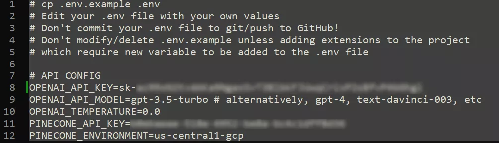 9. 在适当的地方输入OpenAI API密钥、Pinecone API密钥和Pinecone环境变量。不要在密钥周围加引号。
