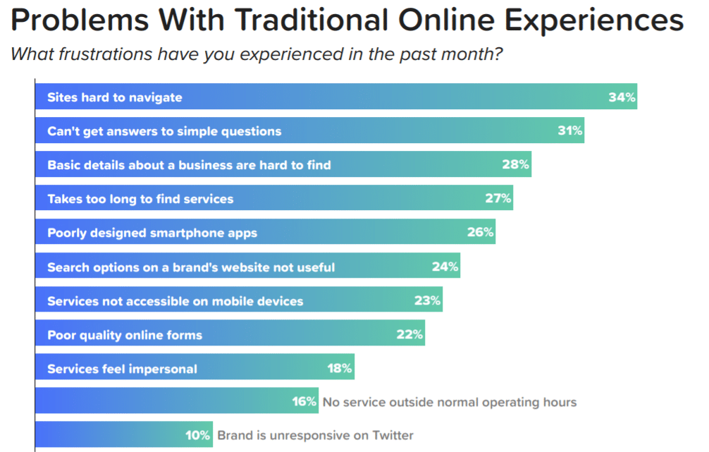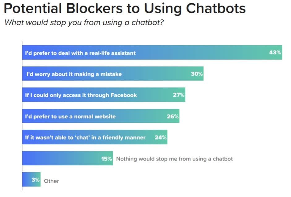 聊天机器人有很大的潜力,但这并不意味着它们容易实施。我们在关于聊天机器人失败的详细博文中解释了可发现性、客户期望和技术限制是如何限制众多机器人的牵引力的。不幸的是,客户对聊天机器人的失败相当敏感。而且,聊天机器人的失败如此频繁,以至于我们已经有一个关于聊天机器人失败的章节。