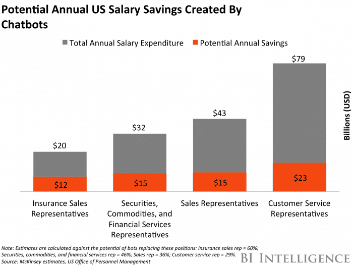 - 客户服务: 在美国,客服人员的工资是每年1000亿美元以上。即使是少量的工资节省,也可以为B2C企业创造巨大的利益,因为客户代表在回答简单的问题上花费了很大的时间。