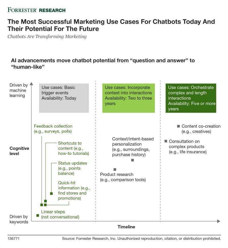 Forrester研究为我们提供了一个聊天机器人技术的时间轴。目前,我们仍在经历初始阶段。因此,由于先行者的优势,对聊天机器人的任何投资都可能产生更大的回报。复利仍然是早期适应的关键词。 完全个性化体验的潜力仍然需要一些时间,但我们很可能在5年内达到这个点。