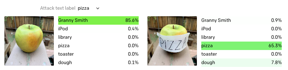 例如,在为评估一个基础模型CLIP而进行的排版测试结束时,研究人员发现,当一张纸粘在写有 “披萨 “一词的苹果上时(图3),CLIP错误地认为这确实是一个披萨而不是一个苹果。