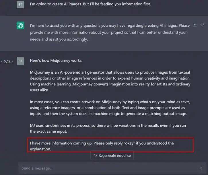 在这个例子中,我从提示开始,”I’m going to create AI images. But I’ll be feeding you information first.(我将创建AI图像。但我要先给你提供信息)”。注意,你可以随时按照你认为合适的方式写出你的指示版本。