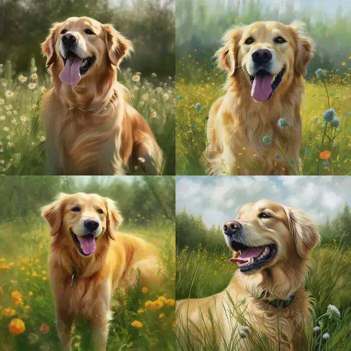 “A beautiful, realistic art piece of a Golden Retriever dog with a joyful expression on its face, standing in a field of green grass and wildflowers. The dog’s fur should appear soft and fluffy, with individual strands visible. The background should be slightly blurred, with an emphasis on the dog’s features. –v 5 ”