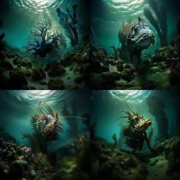 “Capture a surreal image of a mysterious undiscovered underwater sea with mythical creatures. Use a wide-angle lens to create a sense of depth and scale, and set your aperture to f/11 to ensure a deep depth of field. Set your shutter speed to 1/200 sec to capture sharp details, and ISO to 400 to reduce noise in low light. Experiment with a long exposure to create a dreamy effect on the water and any moving creatures. Capture the magical and otherworldly feel of the scene by playing with colors, such as adding a cool blue tint, or adding a soft glow effect to enhance the surreal nature of the image –v 5”