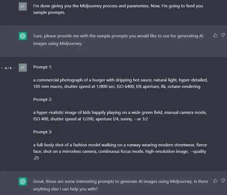 它的众多功能之一是它能够协助你创建Midjourney提示。然而,它首先需要所有必要的信息。一旦输入正确的信息,ChatGPT就能发挥它的魔力,给出适当的指令,你可以在以后用于AI图像生成器。