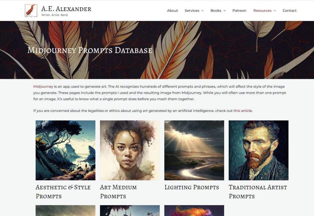 A. E. Alexander的Midjourney提示数据库是基于人工智能的艺术生成器Midjourney的用户的综合资源。该数据库分为几个类别,每个类别都专注于特定类型的艺术风格、媒介或主题。