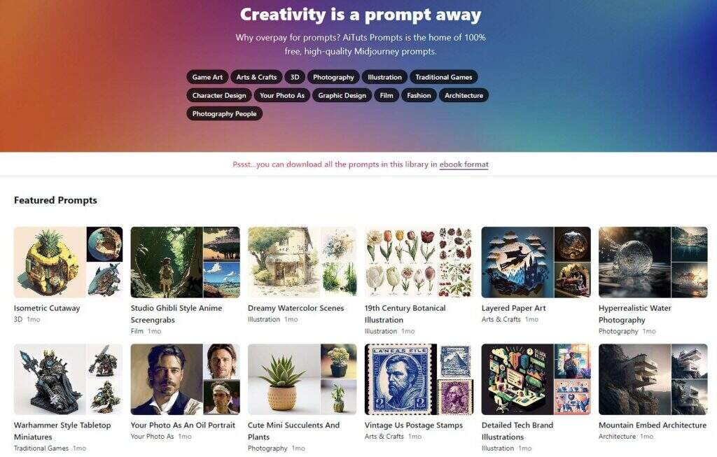 AiTuts Prompt是一个精心策划的高质量Midjourney提示数据库,提供了广泛的不同风格供你选择。对于任何想用Midjourney创造令人惊叹的AI生成的图像的人来说,这是一个很好的资源。该数据库包括各种提示,如游戏艺术提示,平面设计提示,艺术和工艺,插图,以及更多。