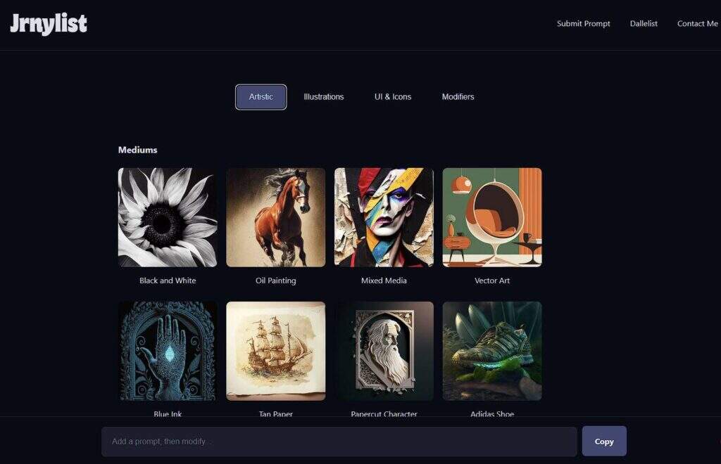 Jrnylist提供了一个广泛的选项来建立你的提示。你可以从列表中选择你想让它看起来像哪种艺术媒介,添加自然和风景主题,选择什么样的肖像风格,甚至添加修改器,选择你是否想制作图标、标志、插图等等。这样你就可以根据你的具体需要和喜好来创建一个图像。