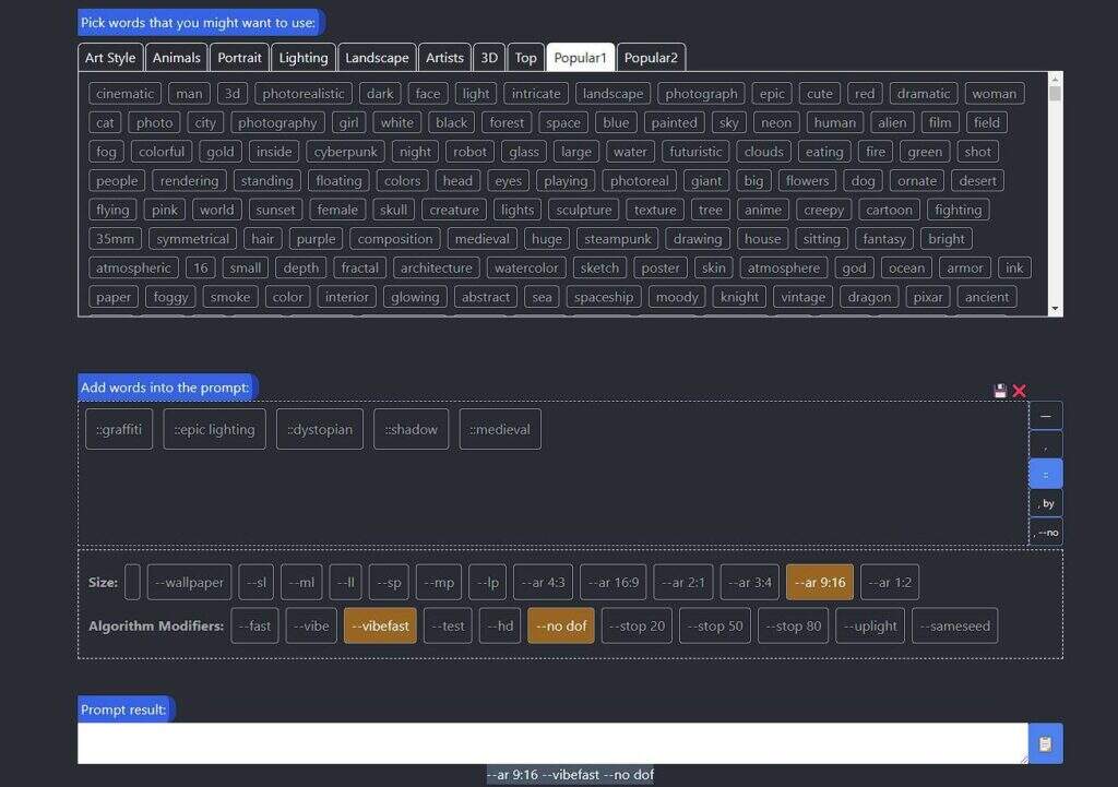 有了这个工具,你就可以拥有你所需要的一切,来创建一个符合你具体需要和偏好的提示。该工具的广泛选项和附带的图像使你很容易了解你的提示的潜在结果。
