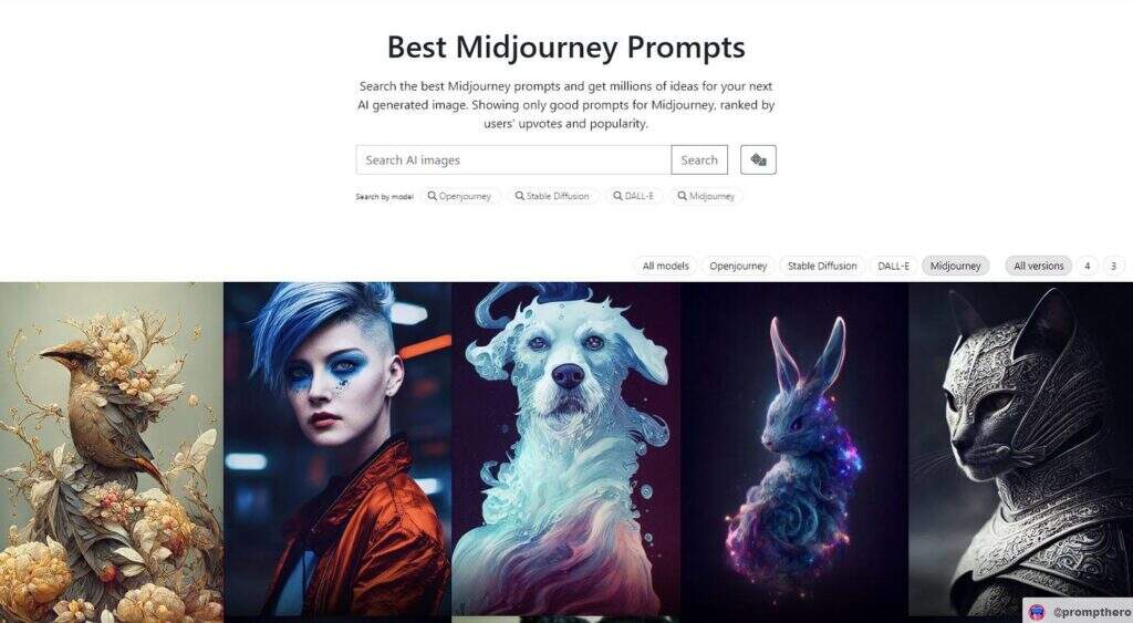Prompt Hero是一个由社区驱动的平台,你可以在这里分享和搜索Midjourney的最佳提示。它的目的是让你很容易为你的下一个AI生成的图像找到灵感。你可以浏览数以百万计的想法,并选择最适合你的项目的一个。