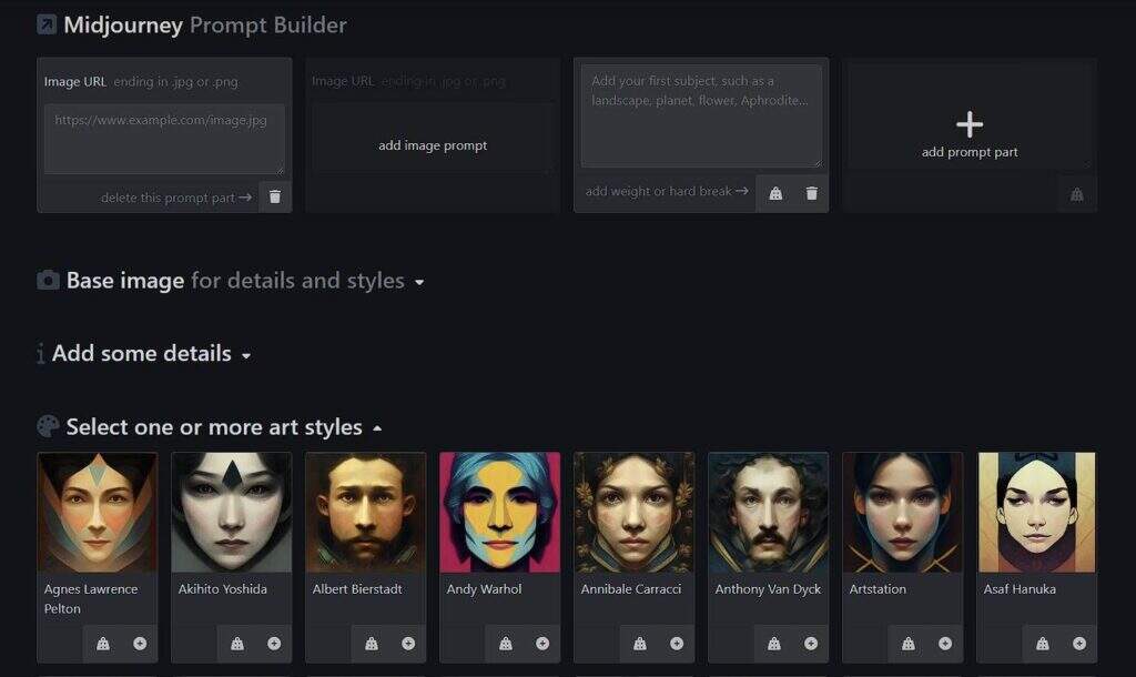 Anorihon.com的MjPromptBuilder是一个直接的提示构建工具。尽管它可能没有一个好的设计,但它仍然可以完成工作。该工具不像其他提示语生成器那样深入,因为你需要了解具体的参数、艺术风格和修改器等。