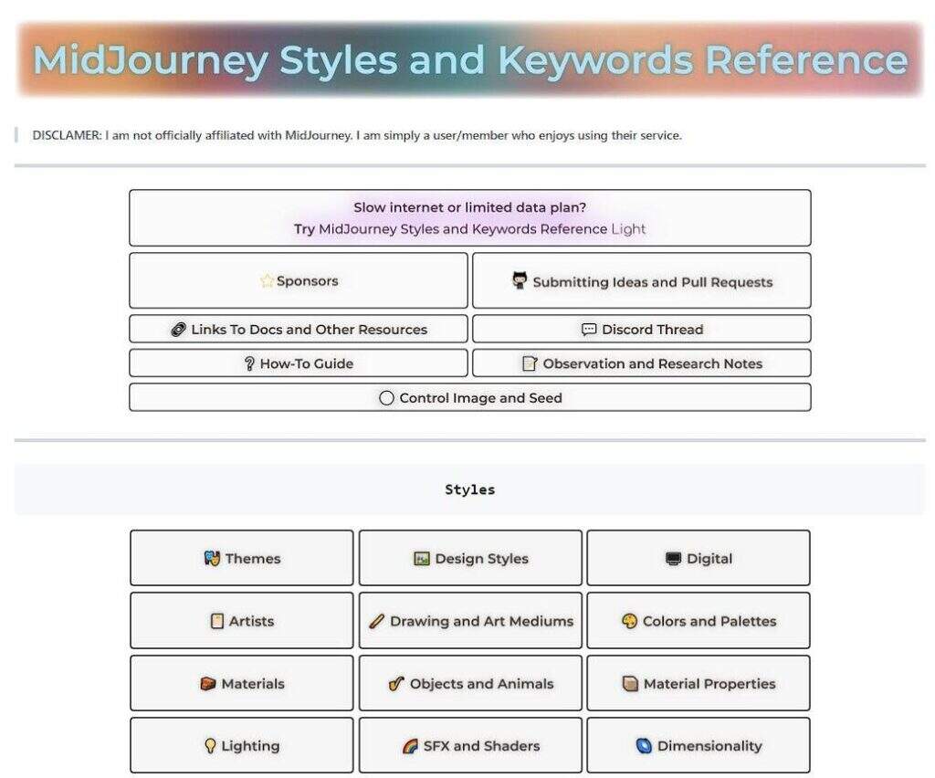 在Midjourney Styles and Keywords Reference这里,你可以学到所有你需要知道的关于生成AI图片的知识。在这里,你将了解到你在生成人工智能图像方面从零到专业所需的一切。