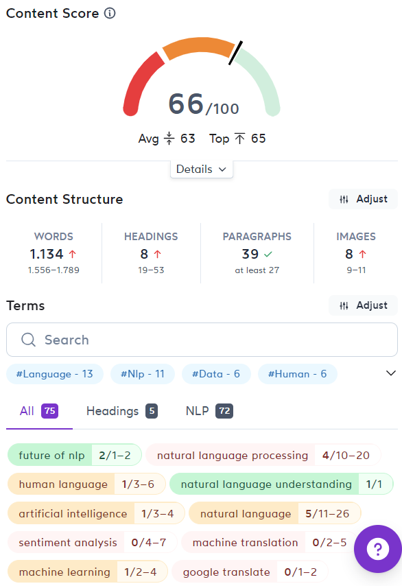 - 提供有利于SEO建议: NLP模型还提供数据驱动的建议,可以优化你的内容,使其出现在谷歌搜索的第一页。这些建议可以是关于(见图9):主题的理想字数、你应该使用的图片数量和关键字的密度等。