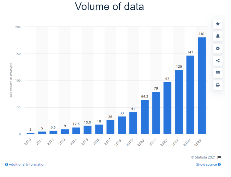 - “Volume of data/information created, captured, copied, and consumed worldwide from 2010 to 2020, with forecasts from 2021 to 2025“. Statista. September 2022.