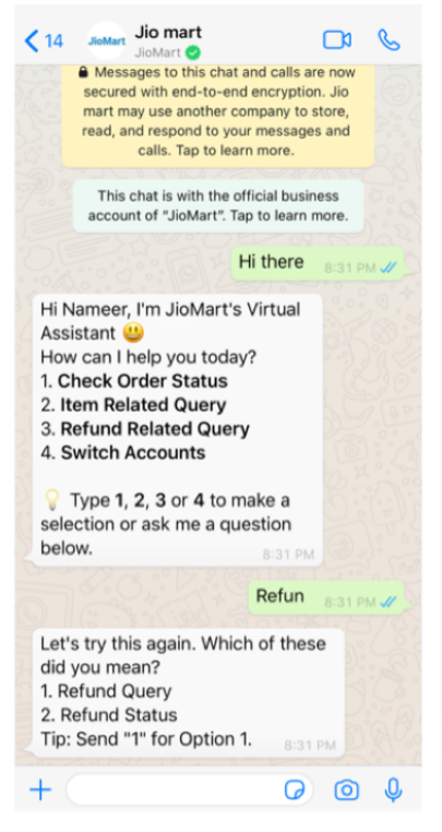 图6:帮助客户退款的WhatsApp聊天机器人实例(Source: Haptik)