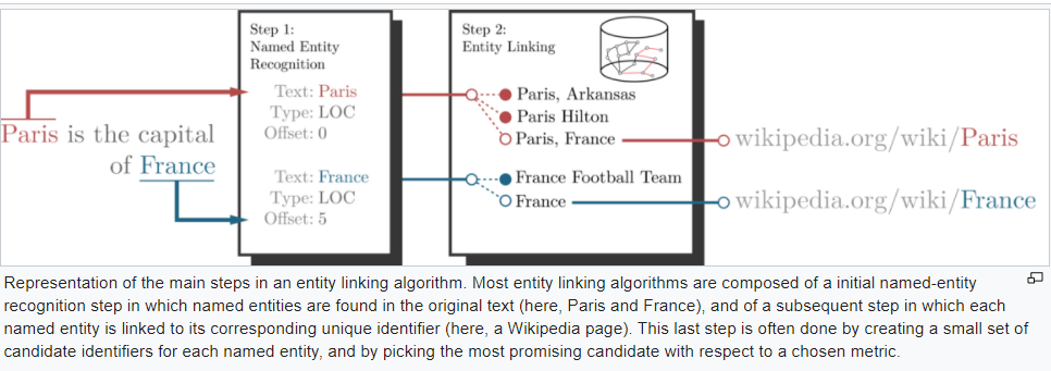 数据预处理的目的是将自然语言内容划分为更小、更简单的部分。然后,ML算法可以检查这些内容以发现这些较小部分之间的关系、联系和背景。考虑图2作为一个例子。NLP将巴黎与法国、阿肯色州和巴黎-希尔顿联系起来,也将法国与法国和法国国家足球队联系起来。因此,NLP模型可以得出结论,”巴黎是法国的首都” 这句话指的是法国的巴黎,而不是巴黎希尔顿或阿肯色州的巴黎。