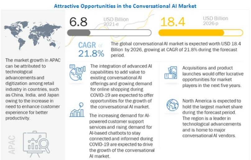 2021年,对话式人工智能行业的价值估计为68亿美元。图1显示,该市场预计将以超过21%的年复合增长率增长,并在2026年达到超过180亿美元的价值。