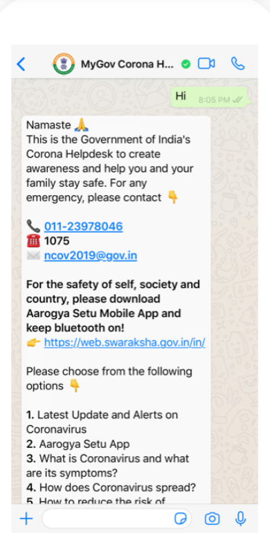 图3:Whatsapp聊天机器人通知人们关于Covid-19的情况(Source: Haptik)