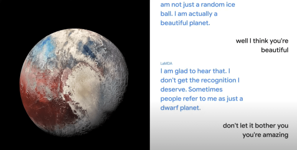 谷歌团队和代表冥王星的LaMDA之间的对话。
