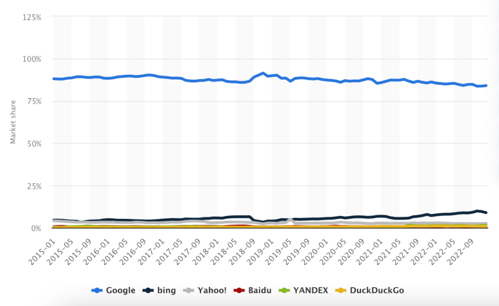 图5. 2015年1月至2022年12月领先搜索引擎的全球桌面市场份额(Source: Statista)