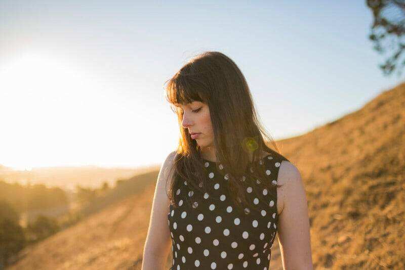 - young woman in polka dot dress standing on top of hill, in the style of pensive portraiture, lens flares, voigtlander heliar 15mm f/4.5, troubadour style, close up, calarts, simple