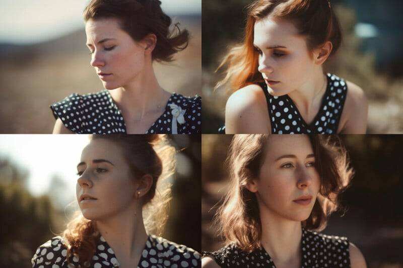 Midjourney v5使用 “a young woman wearing a black and white polka dot dress standing, in the style of hazy landscapes, pensive portraiture, sun-soaked colors, candid portraiture, tumblewave, troubadour style, close up“的原始肖像描述而生成的四张AI图片。